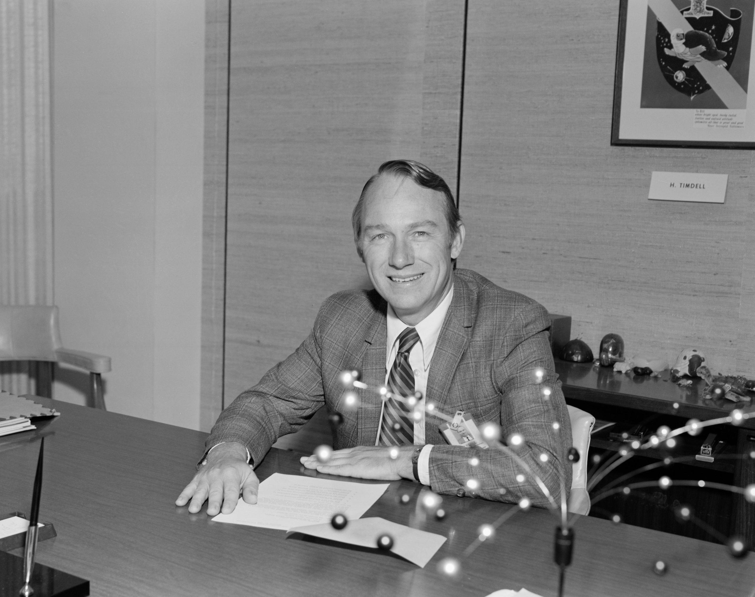 Edited 9 August 2019 to add: My theory above about that misspelling on his wall is now inoperative…defunct…shot down. The Johnson Space Center History Office has kindly found and sent me the original of that official photo along with nine others of Tindall from 1965-1979, which I’ve just posted here: https://finleyquality.net/The-ringmaster. In that post, I offer some deductive reasoning on the uncropped version of that photo that reveals the much more likely source of “H. Timdell” [sic]: the incorrigible Pete Conrad.