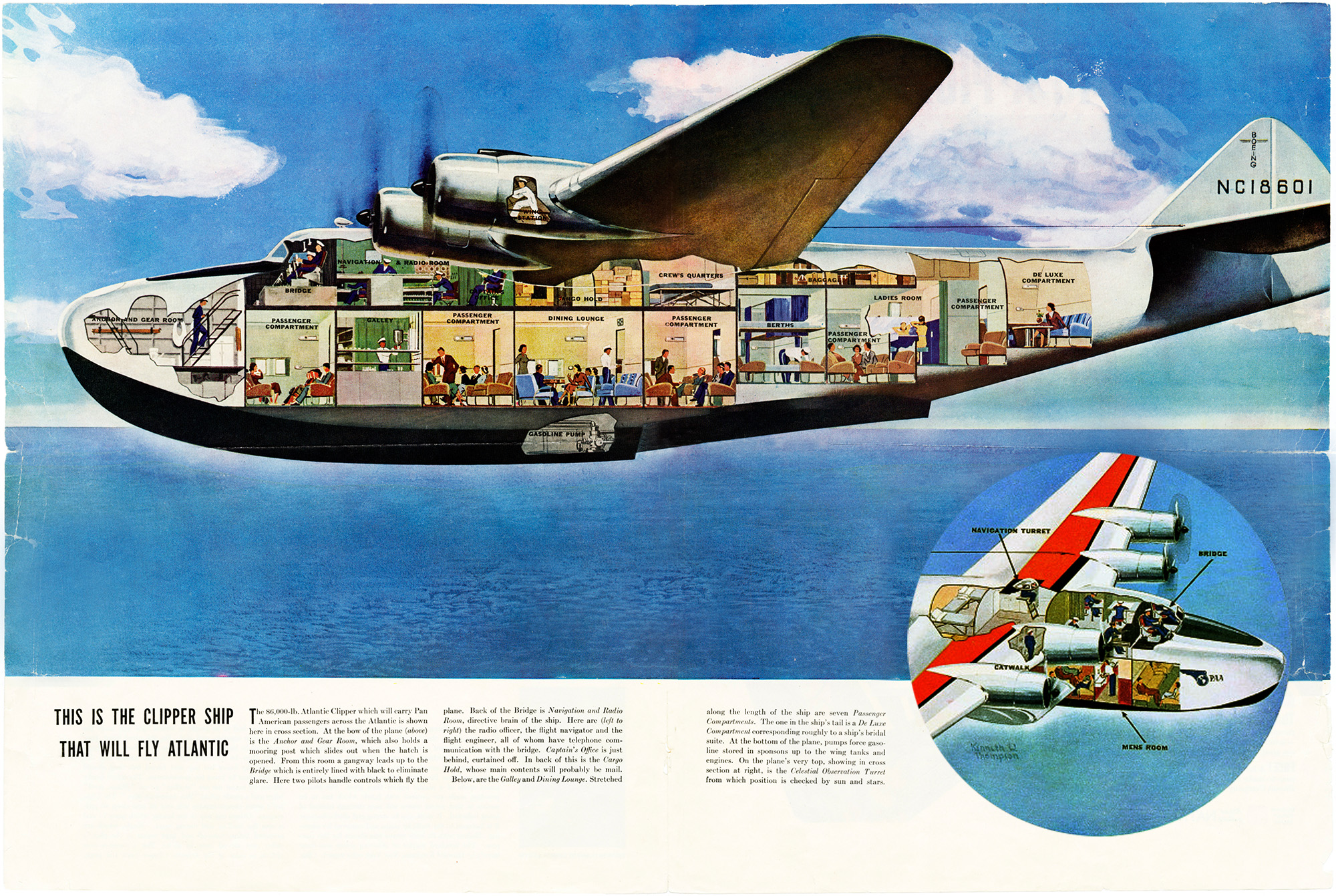 Only twelve B-314s were produced by Boeing, all for Pan Am, but it was – and still is – considered the acme of flying boat technology. The initial six had a range of 3,500 miles with fuel capacity of 4,200 gallons and the second group of six could travel 5,200 miles with 5,400 gallons, both variants far exceeding the range of other aircraft of the day. Travel on the clippers was strictly deluxe, with ticket prices comparable to Concorde’s and meals catered by top-notch hotels.